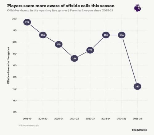 近年英超前5轮越位次数。