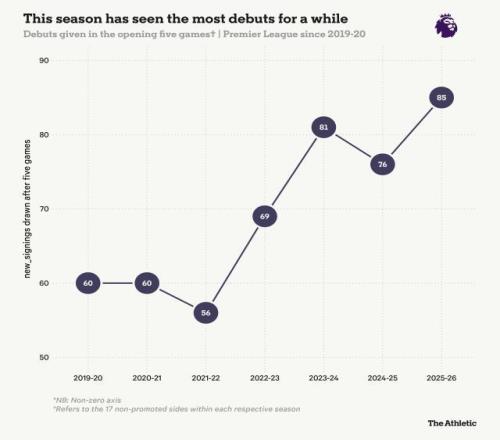 近年英超前5轮首秀球员数量。