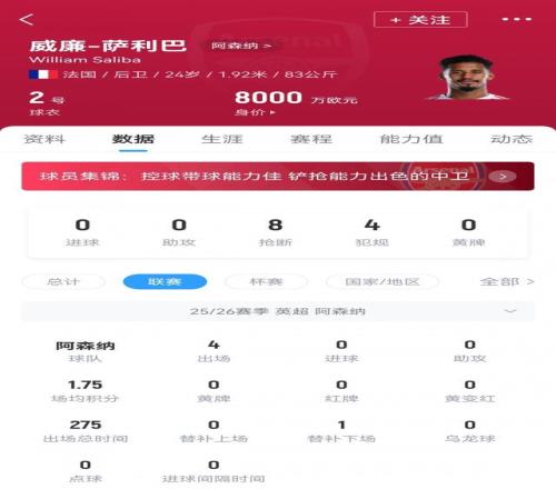 萨利巴现年24岁,法国中卫,阿森纳在2019年花费3000万欧元将其从圣埃蒂安签下。目前萨利巴总计代表枪手出战139次,贡献7球3助,随队收获两个社区盾冠军。目前球员德转身价为8000万欧元。