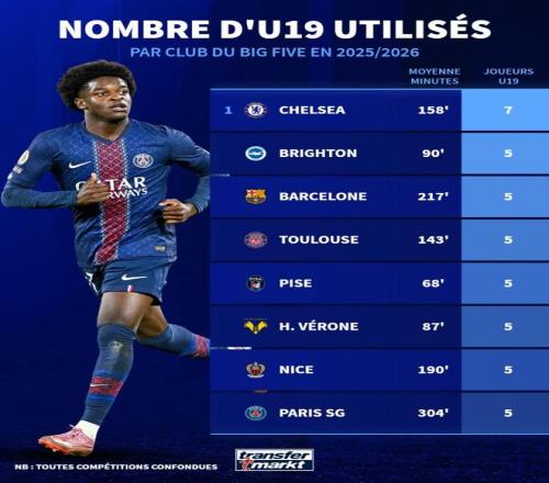 北京时间10月7日,来自德转的统计指出,本赛季至今巴黎圣日耳曼是欧洲五大联赛俱乐部里给予U19球员出场时间最多的俱乐部,切尔西则是使用U19球员人数最多的俱乐部。