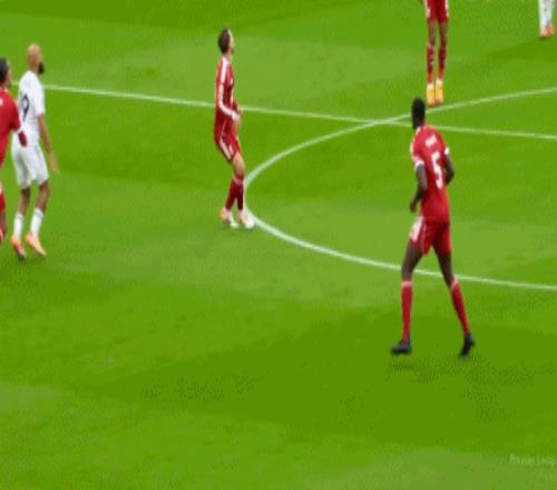 慢镜显示,麦卡利斯特当时后撤与姆贝莫争抢头球,却被队友范迪克意外肘击倒地。