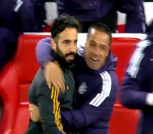 在曼联庆祝进球时,麦卡利斯特继续接受两名队医的治疗,他的头部随后包上了黑色的护具。
