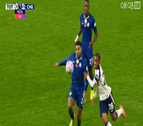 第90+1分钟,詹姆斯禁区内手部碰到皮球,主裁判未予判罚