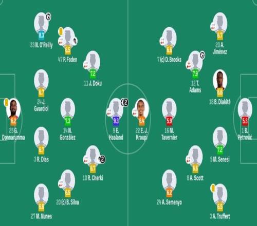 曼城首发:25-多纳鲁马、27-努内斯、3-迪亚斯、24-格瓦迪奥尔、33-奥赖利、14-尼科、20-B席(90'21-努里)、47-福登(90'16-罗德里)、10-谢尔基(73'4-赖因德斯)、11-多库(73'26-萨维尼奥)、9-哈兰德(82'7-马尔穆什)