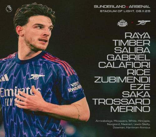 阿森纳首发:1-戴维-拉亚、12-廷贝尔、2-萨利巴、6-加布里埃尔、33-卡拉菲奥里、41-赖斯、36-苏比门迪、10-埃泽、7-萨卡、19-特罗萨德、23-梅里诺