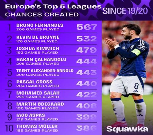当地时间11月18日,知名数据机构Squawka发布了自19/20赛季起欧洲五大联赛的创造机会榜。