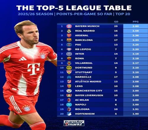 在本周末五大联赛战火重燃之前,《德国转会市场》统计了本赛季五大联赛球队场均拿分的榜单,拜仁领跑,皇马紧随其后,阿森纳排在第三。