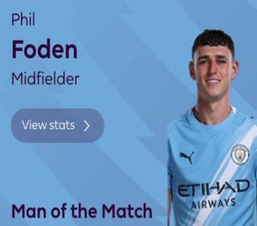 最终经过英超官网球迷投票,福登以71%的得票率当选全场最佳球员。