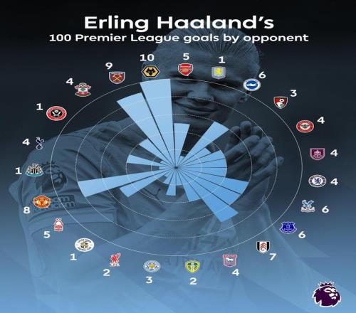 在今天凌晨进行的英超第14轮比赛中,曼城客场5-4击败富勒姆,其中哈兰德打入一球,达成了英超100球里程碑,英超官方也晒出哈兰德100球攻破球门对手分布。