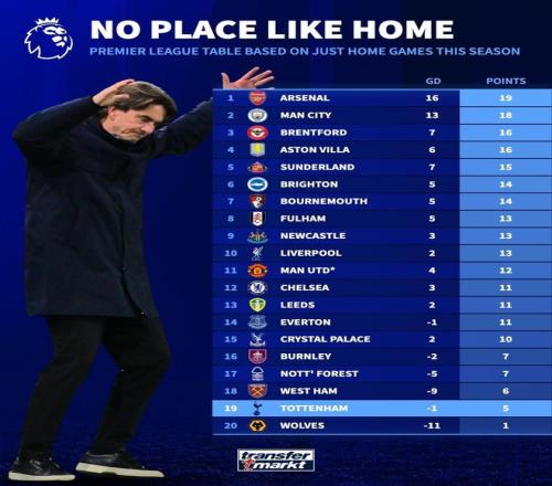 足球数据网站德转盘点了本赛季英超主场战绩榜,其中,领头羊阿森纳积19分居首,曼城18分紧随其后,曼联少赛一场拿了12分,热刺仅积5分位列倒数第二。