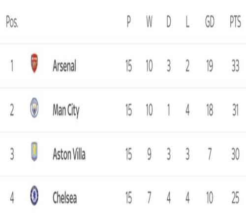 在萨利巴受伤之后,阿森纳近三场联赛仅取得一胜一平一负的成绩。负于维拉之后,阿森纳15轮之后继续以33分领跑,维拉则以30分反超曼城,暂时排名第二位。