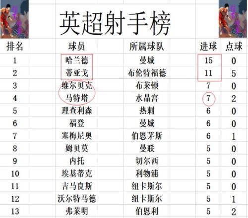 射手榜方面,哈兰德15球领跑,蒂亚戈11球排名第2,马特塔今天没有进球,还是和维尔贝克7球并列第3。内托,埃基蒂克,姆贝莫等人5球刚好挤入前十。