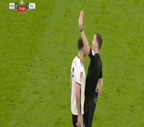 曼联球员也曾有过“计划通”的高智商时刻,2023年足总杯,桑乔就上演了天才的戏码。面对绝佳机会,他犹豫调整后一脚射门,瞬间点燃火药桶。裁判对富勒姆连掏三张红牌,比赛悬念瞬间蒸发。这脚“一计害三贤”,堪称球场魔法攻击。
