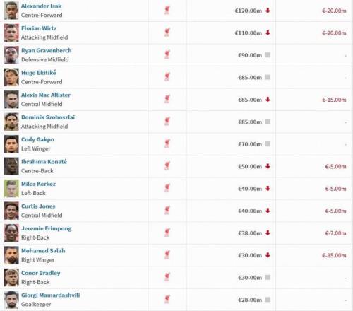 北京时间12月9日,德转公布了新一期的英超身价榜,利物浦这边无人上涨多人下跌,伊萨克维尔茨下跌2000万欧,萨拉赫下跌1500万欧。