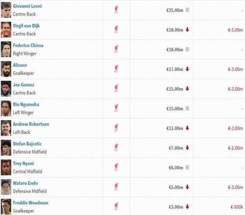 (注:榜单中未列及的球员维持原身价,本期身价没有更新)