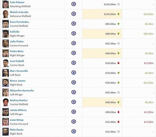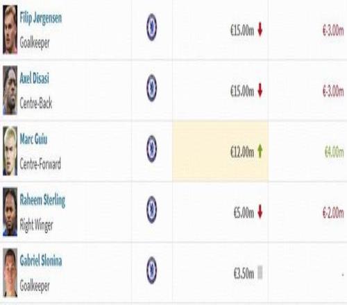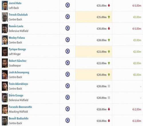 北京时间12月9日,德转公布了最新一期英超球员身价,切尔西这边,埃斯特旺上涨2000万欧,德拉普等球员下跌500万欧。