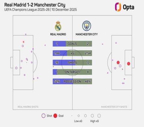 欧冠联赛阶段第6轮,皇家马德里主场1-2不敌曼城,此役皇马仅1次射正,为有统计以来皇马欧冠主场最低。