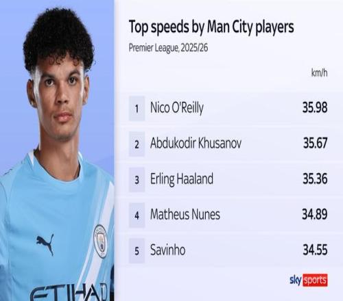 曼城左后卫奥赖利本赛季有出色的发挥,这名20岁小将在14次英超登场中斩获1球3助攻,他也是本赛季曼城冲刺速度最快的球员。