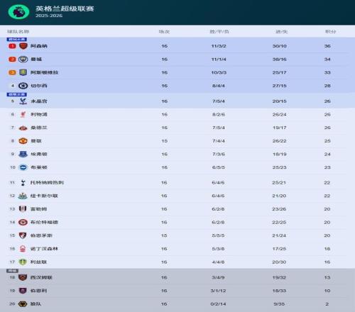 随着诺丁汉森林3-0托特纳姆热刺、桑德兰1-0纽卡斯尔联、西汉姆联2-3阿斯顿维拉、水晶宫0-3曼城,英超第16轮最新积分榜出炉!