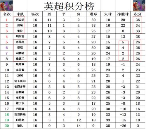 积分榜方面,第一阶队的三强咬的很紧,阿森纳还是2分优势力压曼城领跑,阿斯顿维拉差阿森纳3分排在第3。争5就更激烈,曼联今天惨遭绝平,无力追上切尔西冲进前5,现在争5的四支球队都是26分,曼联净胜球优劣势,超过利物浦,排在水晶宫之后位列第6,利物浦被挤到第7。