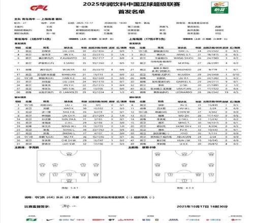 北京时间10月17日18:00,中超第27轮展开争夺,上海海港作客青岛青春足球场挑战青岛海牛,本场主裁判为王竞,VAR裁判为甄伟,赛前双方首发出炉。