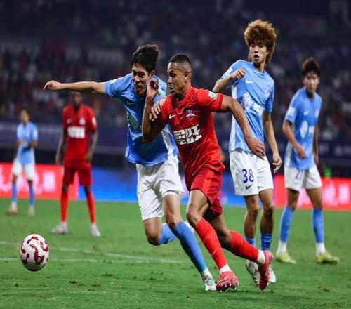 青岛海牛(橙)击败武汉三镇多少占了赛程的光