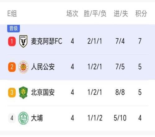 随着第4轮的结束,E组最新积分榜也发生变化,此前排名垫底的国安,取胜之后积分来到5分,追平了人民公安队,小组赛还有最后两轮,希望北京国安再接再厉,一举出线!