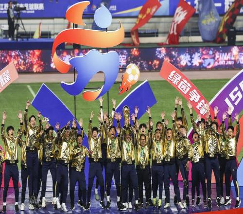 11月1日,“苏超”冠军泰州队在颁奖仪式上庆祝。(新华社)
