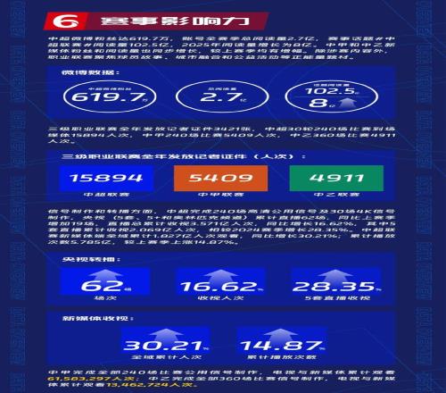 赛事影响力方面,赛事话题.5亿;央视直播了62场中超,累计收视3.571亿人次,同比增长16.62%;中超新媒体端全域累计1.827亿人次观看,同比增长30.21%。