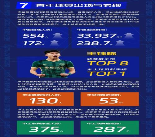 中超U21球员出场554人次,首发307人次,总出场时间33,937分钟,场均出场人次比2024赛季增长了172%,场均出场时间比2024赛季增长了238.7%,这是一个巨大的增长幅度。