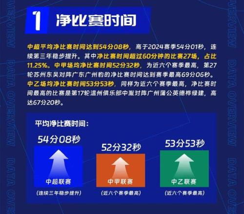 竞赛层面,中超平均净比赛时间达到54分08秒,高于2024赛季54分01秒,连续第三年稳步提升;中甲场均净比赛时间52分32秒,为近六个赛季最高;中乙场均净比赛时间53分53秒,同样为近六个赛季最高。