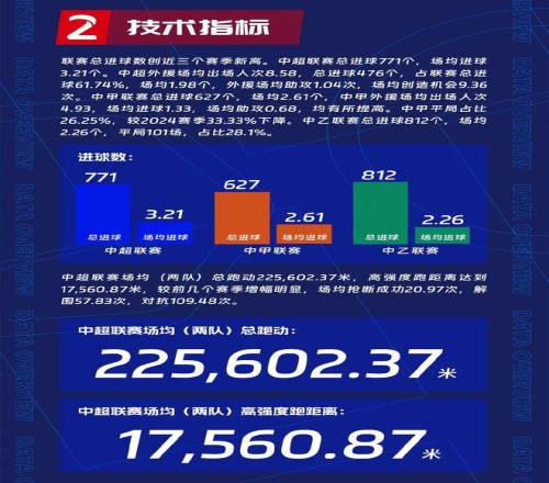 中超场均(两队)总跑动225602.37米,高强度跑距离达到17560.87米,较前几个赛季增幅明显,场均抢断成功20.97次,解围57.83次,对抗109.48次。
